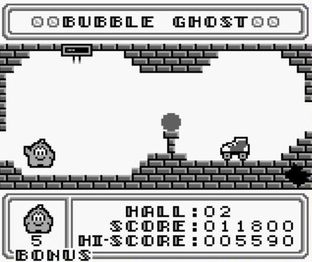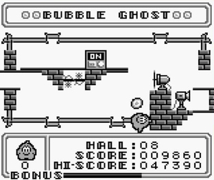 Dans Bubble Ghost sur Gameboy, vous incarnez un fantôme dans un château. Vous devez souffler sur une bulle pour l'emmener à la sortie de chaque niveau. Il faut cependant faire attention aux nombreux obstacles, à commencer par les bougies que le fantôme peut éteindre en soufflant dessus. Le spectre souffler dans 8 directions : haut, bas, gauche, droite et les 4 diagonales et il dispose de 5 bulles avant de perdre la partie.