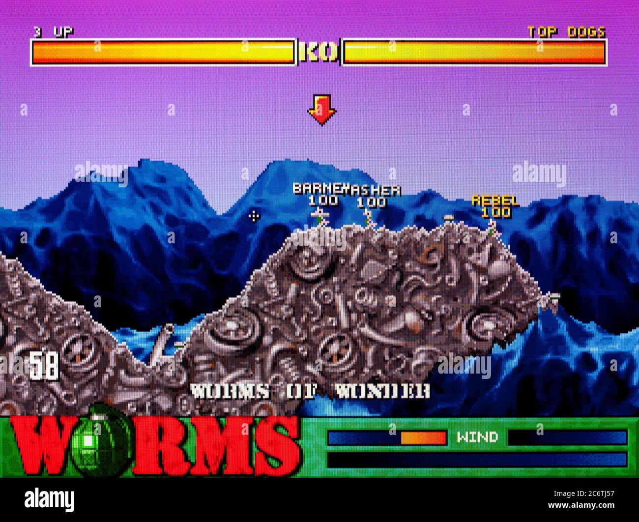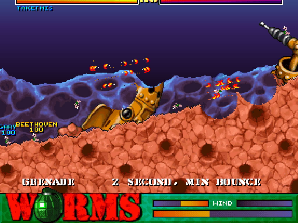 Worms est un jeu d'action stratégique sur Playstation. Le joueur prend le contrôle d'une équipe de vers de terre qui devront en annihiler une autre grâce à diverses armes loufoques. A tour de rôle, les équipes ont une minute pour lancer une attaque grâce à un de leurs lombrics guerriers. Il faut donc choisir minutieusement sa cible, et savoir utiliser l'arme adéquate à la situation pour faire le maximum de dég